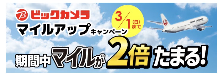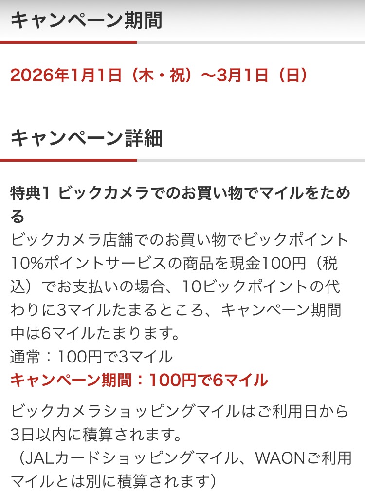 というのも、ビッグカメラ店舗でのお買い物で、通常の2倍!100円で6マイル貯まるマイルアップキャンペーンが実施中だったのです。(※2026年1月1日〜3月1日までのキャンペーン)