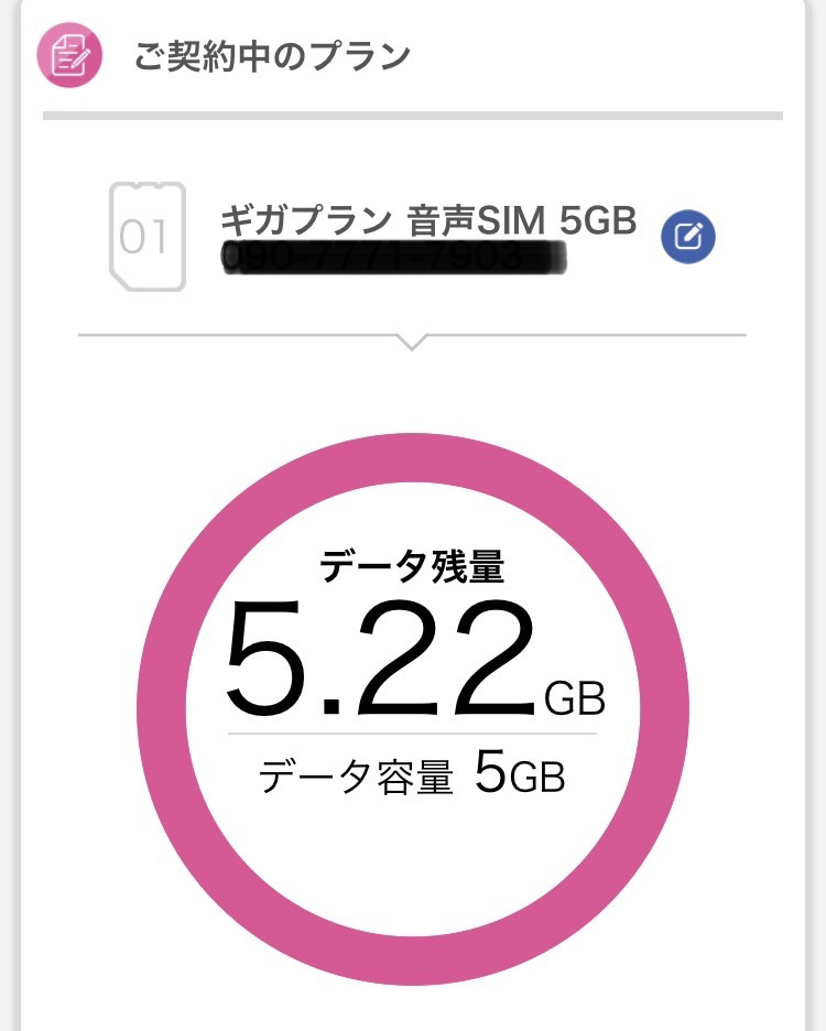 筆者は5GBプランですが、余ったデータは繰り越され、データ残量はこんな感じ↓↓でアプリに表示されるので、すごくわかりやすいです。