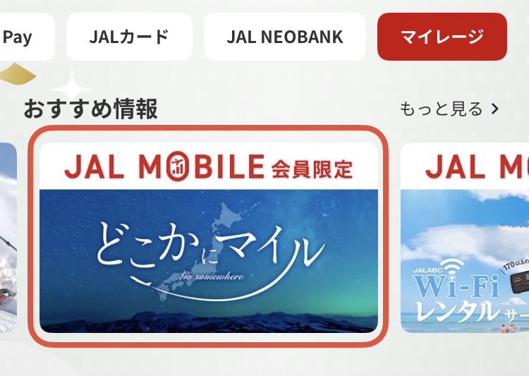 どこかにマイルの特典は、JMBアプリのホーム画面を右にスワイプすると表示されるJAL PAY画面下の「おすすめ情報」に表示されます。
