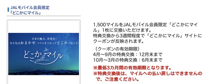 表示されるバナーから、どこかにマイルを利用できるクーポンに1,500マイルで交換できます。(年度内に1回のみ)